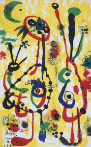 Un des 17 premiers exemplaires sur Hollande signé par André Breton comportant une belle lithographie originale en couleurs hors texte de Joan Miró (seuls 50 exemplaires comportent cette lithographie).