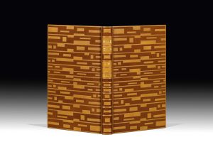 In-12, box ocre mat, plats entièrement ornés d’un décor géométrique mosaïqué en box verni de même couleur mais d’une nuance plus soutenue, décor se prolongeant sur le dos lisse, doublure et gardes d’agneau velours de même couleur, gardes encadrées d’un filet doré, tranches dorées sur témoins, couverture et dos conservés, chemise à dos et rabats de même box, étui (P.-L. Martin, 1966).