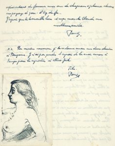 2 pages in-4. un dessin original à l'encre et aquarelle contrecollé (buste de femme nue), 1 page in-18, sous chemise demi-maroquin noir.