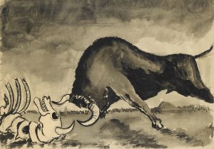 Lavis original et encre sur papier, dédicacé, signé au crayon au recto par Oscar Dominguez : Pour ma petite Colombe chérie. Oscar Dominguez, représentant un taureau furieux chargeant une carcasse.