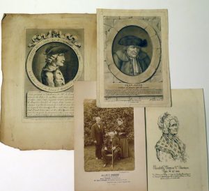 Bonne condition générale. Joseph Rullier agé de cent neuf ans (...), c. 1778-1779. 2 eaux-fortes : en buste de profil, par Le Roy d'après J.J. Hubert, 21,4 x 13,5 cm. - En pied, par Dorgez d'après C.J. Desrais, 26,5 x 16 cm. Petits défauts marg. Légendes gravées dans la partie inf. J. Rullier naquit en 1673 en Savoie. - Jean Jacob habitant du monjura agée de 120 ans, c. 1789. Aquatinte par Angélique Briceau d'après Flouest,  21 x 15 cm; texte gravé dans la partie inf. Petit défauts marg. Né en 1669 et décédé en 1790. - Elisabeth Thomas Vve Durieux, âgée de 117 ans, 1830. Eau-forte par Hyacinthe Langlois, 20 x 12,5 cm. Serait née en 1713. - Jean-Pierre Nordet à l'âge de 100 ans et un jour, 1885. Photogr. par Letellier, 15,5 x 10,9 cm, montée sur carton légendé. Né en 1785, représenté avec son fils et sa belle-fille.