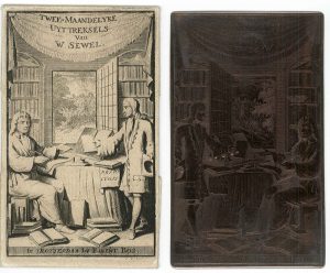 "Twee-maandelyke uyttreksels van W. Sewel te Rotterdam by Barent Bos", s.d. [18de eeuw], 13,6 x 8,2 cm; gesign. "C. Huyberti" (slecht leesbaar), getiteld. Opgeborgen in mapje met afdruk van de plaat. Licht bevuild. Afbeelding van twee mannen in een bibliotheek. Titelp. van een tweemaandelijkse publ. uitgegeven door W. Sewel tussen 1702 en 1704, opvolger van "Boekzaal, De boekzaal van Europe".