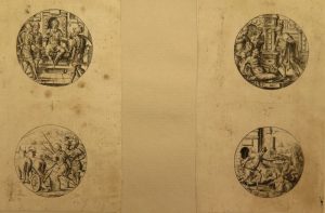 12 petites gravures, rondes (4, diam. 3,2 cm) ou ovales (8, 2,8 x 3,8 cm), sur 6 ff., vergé 9,5 x 5,5 cm; monogr. "S" pour Stephanus, cert. avec mention "cum priv. regis". Montées sur 3 ff. dans un album, 16,5 x 21,5 cm, demi-veau à coins moderne, dos lisse titré or. Nombr. ff. vierges in fine. Qqs min. souill. sinon bon ensemble.  Suite complète, état unique. Sujets mythologiques ou antiques, représentant e.a. des soldats romains devant un roi assis sur un trône, Cincinnatus et les Romains, un homme en turban combattant un basilic, Diane et ses nymphes, la jeune Atys, 2 femmes dans un temple consacré à Diane, la continence de Scipio, etc. Par le dessinateur, graveur et orfèvre français de la Renaissance E. Delaune (Orléans 1518/19-Strasbourg 1595).