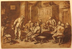 15,3 x 22,5 cm; identified "Ostade" in lower left corner. Stuck by upper corners under passe-partout. Old traces on verso, sm. fold in lower right corner.    Well-executed drawing in the style of Adriaen Van Ostade : animated scene with men and women in a tabagie.