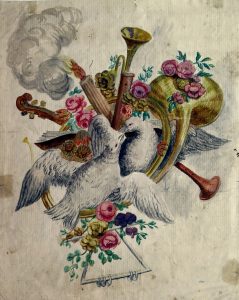 22,7 x 18,3 cm; non signée. Montée par le bord sup. sous passe-partout. Qqs lég. souill., qqs plis surtout visibles au recto, min. déchir. marg., traces de montage ancien au verso.   Jolie pièce emblématique de l'amour et du mariage figurant 2 colombes se becquetant dans un décor combinant des fleurs et feuilles, des instruments de musique et une torche brûlante. Peut-être tirée d'un album amicorum; attribuable à "Huet" selon une note au verso.