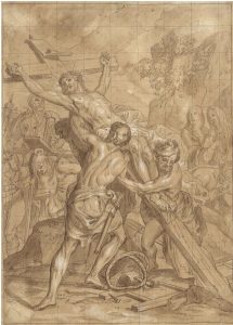 25,5 x 18,7 cm; not signed, recto divided into squares, red pencil transfer on verso. Sm. hole in upper center, sm. tear in lower right corner.  Two men raising the Cross. Beautiful drawing probably reproduced as an engraving.