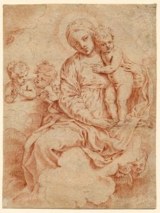 19,5 x 14,8 cm; not signed. Stuck by upper corners under passe-partout. Verso partly underlaid, horizontal central fold not visible on recto.    Charming finely executed representation of the Virgin sitting on clouds, surrounded by putti.