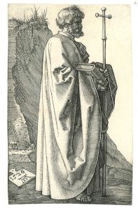 12 x 7,4 cm (trimmed to the platemark, a little more in upper part); engr. monogr. and date. Stuck by upper corners under passe-partout. Old traces on verso.  From the set of the Five Apostles. Small collector's stamp on verso.