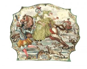+/- 5,5 x 6,3 cm; non signée, titrée comme supra. Très fraîche.  Très charmant tableautin, d'une grande finesse d'exécution : lors d'une chasse, un pli cacheté est échangé au vol entre une élégante amazone assise sur un cheval lancé au galop et un jeune homme à pied; une guirlande florale cerne la scène.