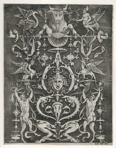 By Agostino Veneziano, 5 pcs : Vase with 2 lions, 1531, Bartsch 550. - Ornament with arabesques, satyrs and head of an ox in the upper part, publ. by A. Salieri, B. 559. - Frieze with a putti and a siren, publ. by A. Salieri, B. 539. - Ionic capital, 1528, B. 528. - Enea Vico, 2 pcs : Foliage scroll, number VI, B. 459. - Ewer, with number IIII and inscription "Romae ab antiquo repertum [1643], cp. B. 430. - [Hans Collaert according to a note], 3 pcs (defect.) : 3 models for drops (pendeloques). - Monogramist L.S.I. : Foliage scroll, monogr. in left lower margin. - Marco Dente, 2 pcs : Foliage scroll with child, B. 557. - Other motif with a vase and a Medusa head, B. 556. - Bernardo Daddi : Ornament after Raphael, n.s., without the name of A. Salieri, B. 84.