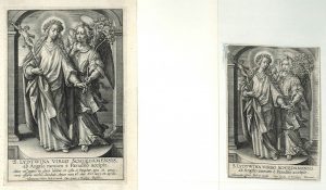Various sizes, some in later impression. Most stuck by upper corners. Some old traces on verso otherwise good general condition.  Hieronymus - S. Thomas de Aquino, publ. by Piermans. - S. Lydtwina Virgo Schiedamensis, publ. by Buschere. - [Same title], different size, publ. by Piermans. Stamp Arenberg and another one on verso. - S. Iudocus Britonum Regis filius, publ. by Piermans. Ms. text on verso. Anton - B. Stanislaus. - S. Norbertus Fundator ord. Praemonstr. Stamp Arenberg and another one. - La Venerable Me Anna de Iesus, later impression, text on verso. - Johannes - [P. Ioannes Costerus]. Cut off and pasted, caption lacking. We join 10 other pcs incl. 2 portraits of Henri III King of Poland (1 by H. Wierix), 4 19th-c. mortuary pictures and 4 devotional pictures. (18 pcs)