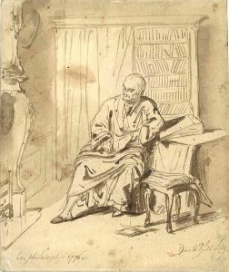 An old man in dressing gown (Voltaire ?) sitting by a fireplace. By David Bles (The Hague 1821-1899), Dutch painter known for portraits and genre paintings.