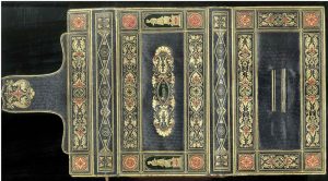 Pochette, 15 x 9 cm, reliure romantique mosaïquée : cuir gaufré bleu nuit, plat sup. orné de larges bordures verticales (statuettes dorées sur socles mos. rouges) et horizontales (jeux de fleurons dorés et rouges ponctués de 4 rosaces dorées et rouges), au centre cartouche de cuir vert titré "Souvenir" inscrit dans de grands fleurons dorés et rouges, plat inf. à rabat, patte et languette de fermeture orné dans le même style que les plats, côtés fleuronnés dorés, intérieur doublé de tabis vieux rose présentant 2 pochettes à rabats et soufflets de fin cuir ivoire.