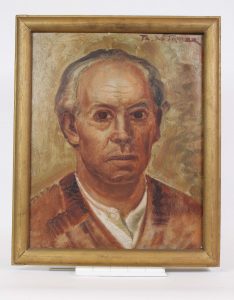 49 x 39 cm; bovenaan rechts gesign. in bruine verf. Ingelijst.  Zelfportret in vooraanzicht in overwegend bruine en okeren tinten.