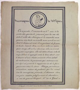 Lithogr. broadsheet, publ. Ghent, Fr. Kierdorff, c. 38 x 33,5 cm. In very good condition Unique (?) lithograph by the pioneer artist Fr. Kierdorff (Trier 1777–The Hague 1855), announcing a reward for a miniature portrait lost in Ghent by the painter Maya. Although Kierdorff is recorded in Ghent since 1820, no dated lithograph by him has been recorded before 1822. The present one must have been published at the end of October or the beginning of November 1821. Kierdorff was in fact the artist who introduced the lithography technique in Ghent.