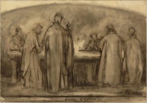 Religieus tafereel : opgebaarde dode omringd door religieuzen. Onderaan links opdracht "voor Jan Van Mechelen". Bijgevoegd : Id. - [Aanbidding van de herders], s.d. Lithografie, simili Japon, 40 x 51 cm; genum. 8/25 en gesign. onderaan rechts. Ingelijst (niet uitgelijst). - Id. - [Vlucht naar Egypte], 1942 Houtskooltekening, 24 x 32 cm; gesign. onderaan rechts. Op verso [Landschap met hooimijten], s.d. Geaquareleerde tekening; niet gesign.