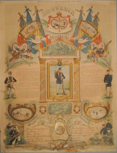 Nice coloured lithograph with some detailed military scenes and images of soldiers in Belgian uniforms. At the bottom an oval photographic portrait of "Joseph Augustin Michaux".
