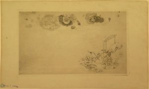Frontière de Belgique, 1886. Eau-forte, vernis mou et pointe sèche, 15,7 x 24 cm, vergé filigrané 20,5 x 31,5 cm. 4e état (sur 4). Cachet vert non identifié au recto. Ref. Rouir 595 et n. 61 pour le cachet. - Le cochon nimbé, 1877-78. Hélio pure, 27 x 22 cm, japon mince ou madagascar 35 x 27,5 cm; petit monogr. au crayon rouge (autogr. ?) au milieu à dr. Une des 3 hélios tirées à partir du dessin "Menu au cochon nimbé". Ref. Rouir II, p. 128. - Le bassoniste, 1874. Eau-forte, 19,8 x 12,8 cm, japon 50 x 32 cm. Tirage postérieur avec la lettre et le trait inf. effacés. Ref. Rouir 755. - "Accouplement préhistorique", s.d. Eau-forte et pointe sèche, 20,5 x 29,7 cm, vergé 36 x 54,5 cm; signée au crayon rouge, titre et mention "1er état" à la mine de plomb dans le coin inf. dr. Fort brunie. 1er état non vu par Rouir, avant les travaux dans les jambes de l'homme, les rochers et le tronc d'arbre. Ref. Rouir 785. Joint, du même : Nouveau Cirque, 1886. Photogravure, japon (?) 23,5 x 28,5 cm. Pli central, traces de montage au verso. Couverture tirée en rouge pour le programme de la soirée d'inauguration du "Nouveau Cirque" le 12/2/1886, texte au verso. Cachet vert comme supra. Ref. Exsteens 1147 selon une note. - Brouet, Auguste (attr.) -  Imprimerie artistique en taille-douce Eug. Delâtre, s.d. Eau-forte, 8,5 x 13,4 cm. (6 pcs)