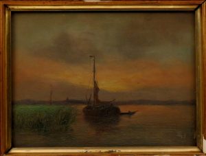 Rustig Schelde (?)-gezicht bij valavond met in de achtergrond een vaag stadsgezichtje en vooraan een tsjalk met half gestreken zeil.