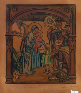 Mooie voorstelling van de aanbidding van de Drie Wijzen, terwijl een klein boerenmeisje een lammetje schenkt aan het Kerstekind. In de achtergrond Sint-Jozef. Met autografe opdracht door de kunstenaar "Hartelijk en eerbiedig aan Z.E.H. J. Van Mechelen, opgedragen ter gelegenheid van zijn zilveren Priesterjubileum".