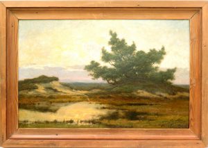 Olieverf op paneel, 28,5 x 46 cm; voluit gesigneerd onderaan rechts. Netjes ingelijst in houten lijstje. Mooi werkje. Charmant polderlandschap met duin en boom.