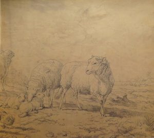 Mooie collectie tekeningen van dieren : paard (ingelijst), schaapjes (gesigneerd en gedateerd), koeien (recto verso en 1 op stof), hondje, maar ook landschappen met bomen (gemonogr.), bootjes op de oever en 1 mooie lavistekening van een berglandschap, gemonogr. onderaan rechts.