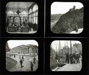 Images of cities, places, hills and castles along the Rhine : Aachen, Bornhofen, Bacharach, Cologne, Drachenburg, Ehrenbreitstein, Godesberg, Gutenfels, Sankt Goarshausen, Kreuznach, Kiel, Koblenz, Lahneck, Mainz, Niederwald, Niederlahnstein, Rheinstein, Stolzenfels, Strasburg, Trier, Wiesbaden. Images of Frankfurt, Hamburg, Nuremberg and Stuttgart. Images of sculptures in museums of Berlin, Cologne, Dresden, Lübeck, etc. Images of churches and old houses in Brunswick, Gladbach, Güstrow, Hildesheim, Halberstadt, Magdeburg, Rostock, Xanten, etc.