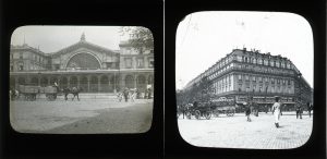 Monuments of Paris : Porte St Denis, Louvre, Arc du Carrousel, Hôtel de Ville, Notre Dame, Pont Alexandre, Trocadero, Arc de Triomphe, Statue de Strasbourg, Père Lachaise, Colonne de la Bastille, Pantheon, Colonne Vendôme, l'Opéra, Place de la République, Tombeau de Napoléon, St Germain des Prés, Jardin des Plantes, Sacré Coeur, etc. One slide of the Paris Exhibition in 1878 with label  "J.B. Medland, optician, 12. Borough, London Brigde". Labels "E. Mazo".