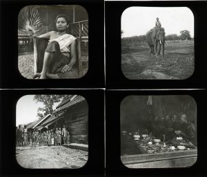 Images of Thailand (formerly Siam). Many images of elephants and of the historical site "Elephant Kraal". Also images of Aytthaya and Bangkok : Buddhist temple complexes, Wat-Cheng and Wat Pho, the Imperial Palace, royal pagodas, etc. Pushkar and Pak-Nam (a "Blockhaus", Chinese solders and a cannon during defence operations). Labels : "Newton & Co".