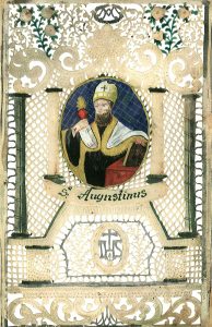 Canivet - S. Augustinus. Canivet gouaché sur peau de vélin, 15,5 x 11 cm. Part. monté sur f. de support. Pourtour bruni, qqs manques dans la gouache, spécialement dans l'encadrement.