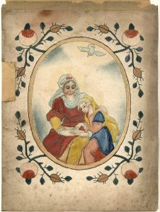 Broderies au passé empiétant ou peintures à l'aiguille, visages, mains et fonds dessinés, toutes inscrites dans un cadre ovale 14,5/15 x 11 cm. Soit : [Ste Anne apprenant la lecture à Marie], 22,5 x 17,3 cm; cadre cerné d'une guirlande florale. Pourtour poussiéreux, manque effleurant la guirlande dans la partie g. - [Joseph et l'enfant Jésus], 21,5 x 15 cm. Fraîche. - [Non ident.], 24,5 x 17 cm; cadre cerné d'une guirlande florale. Qqs trous de vers marg. Christ-Roi ? Personnage moustachu, couronné et vêtu d'un manteau fleurdelisé; il tient une couronne d'épines et un sceptre.