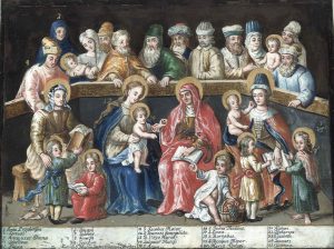 Superbe "photo de famille" savamment rehaussée figurant 25 saints, apôtres, prophètes... identifiés par un numéro à l'encre dorée (qqs-uns peu lisibles), de "Anna Prophetissa" à "Cleophas", avec la Vierge, Jésus et ste Anne au centre. Certains personnages sont représentés sous forme d'enfants, voire de bébés.