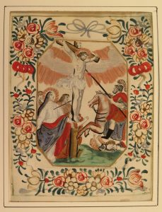[Christ en croix], 19,9 x 14,5 cm. Min. souill. marg. sinon très fraîche. Soldat romain à cheval perçant de sa lance le corps du Christ; au pied de la croix, Marie, également transpercée d'un glaive, saint Jean et d'autres personnages. Encadrement floral gouaché. - Ecce Homo, 19,5 x 15,5 cm. Pourtour bruni, lég. mouill. marg. Le Christ couronné d'épines et vêtu de pourpre. Encadrement floral gouaché.