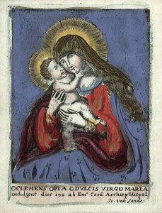 2 pièces gouachées (coeur brûlant et "Ego sum panis vivus"). Les autres gravées par J. Van Sande, Huberti, M. Cabbaeÿ, Neel, C. Galle, Leys, Fruÿtiers, Van Merlen, De Boudt..., cert. non signées. Sujets : "O clemens, o pia, o dulcis Virgo Maria indulgent dies 100 (...)", "Mater de cor Carmeli", "Vera effigies Matris Iesu (...) Kevelaer (...) 1649", "Familia sacra", "Het beeld van onze Lieve Vrouwe van Scherpenheuvel (...)", "S. Crux Mosae Traiecti", "Mater dolorosa", "Fuga in Aegyptum"..., SS. Elisabeth, Augustinus, Sebastiaen, Barbara, Casimirus, Ursula, Caecilia, Margareta, Melchior, etc. Joint : 36 images pieuses, XXe s. En n/bl ou en couleurs. Conservées comme supra. Principalement des images de communion dont une série de 7 similaires, 4 publ. par Maredret, qqs-unes impr. en Italie, etc. (2 albums)