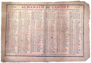 Intéressante collection. Avec e.a. Almanach de cabinet 1729. Reims, R. Florentain. Imprimé en noir et rouge. - Nouveau calendrier de la République française pour la 2ième année (- 3ième année). Bords gravés. - Décadaire des poids et mesures pour l'an III (sextile) de la République française. Impr. Pellier. - Calendrier perpétuel utile au commerce. Empire Français siècle XIX. Paris, Manufacture du Calendrier perpétuel du siècle XIX. - Almanach des monnaies de France, en or, argent, bronze et cuivre 1836. Paris, Delios. - Nouveau calendrier populaire. Une noce en tramways. Paris, Bréval, belle ill. lithogr. par Moloch. - Calendrier des amoureux. Paris, F. Meunier, s.d. - Calendrier drolatique pour 1840. Impr. L. Bouchard-Huzard. - Guide des postes. Bruxelles, Gruyot frères. - Calendrier comique 1884, Vente aux enchères. Impr. Bernard et Cie. Avec caricature par Jamin. - Calendrier 1845 poste aux lettres de Tours. Impr. lithogr. Clarey-Martineau. Avec 4 vues de ville. - Seuls Poids & Mesures légaux à partir du 1er janvier 1840. Paris, Hullin & Cie. - Calendriers 1825, 1827 (Paris, Lefuel) et 1835 (Paris, Janet). Jolis calendriers gravés. - Calendrier lillois 1880. Lille, Imp. lithogr. Boldoduc, avec belle vue lithogr. - 2 calendriers italiens : Spagnola per l'anno 1875. Bologna, Il Papagallo. Grande et décorative lithogr. en coul. - Fra i due litiganti chi vincera ? Anno bisestile 1868. Milano, M. Ranza. Avec caricature lithogr. en coul.