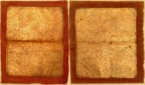 Feuilles similaires mais non identiques. Imprimées de légers motifs floraux dorés sur fond rouge brique, l'un virant vers le brun. J. Maisch fut actif c. 1820-1849.