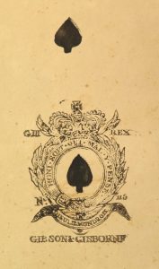 Jeu à figures archaïsantes aux vifs coloris. As gravé sur bois "G. III Rex" et "N° 115" mais sans surcharge fiscale. Peut-être un faux exécuté en Belgique (Bruxelles ?) pour échapper aux taxes anglaises qui étaient très importantes. Belles feuilles.