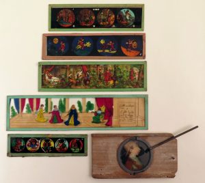 2 séries complètes, impression rehaussée, 5,5 x 23,3 cm, papier vert, dans une boîte en bois, couvercle coulissant, texte en français : Cendrillon (9 pcs) et La Belle aux cheveux d'or (6 pcs, 1 cassée sans manque). 62 pcs diverses, chromolit., sans texte : 5 x 18 cm, 12 pcs, papier vert (1 cassée avec manque) dont 10 présentant 4 vignettes rondes (scènes enfantines, paysages...). - 4,2 x 17 cm, 11 pcs, papier rose : 4 vignettes rondes sur un thème (jeux d'enfants, transports bizarres, marquis & marquise, musiciens...). - 4,4 x 15,7 cm, 23 pcs (1 coin manquant), papier vert, 4 vignettes rondes avec mention de tomaison dans la partie sup. et chaque vignette num. (histoires diverses, qqs-unes semblant extr. des "Mille et une nuits"). - 4 x 15 cm, 8 pcs, papier rouge, 4 vignettes rondes avec mention "J.F." dans la partie sup. (animaux, enfants, paysages...). - 3,5 x 13 cm, 8 pcs (1 coin manquant), papier vert, dont 2 pcs avec 5 vignettes rondes (animaux anthropomorphes), les autres présentant une scène unique.  Joint : une plaque animée allemande (verre cassé sans manque) : homme se transformant en singe. (78 pcs)