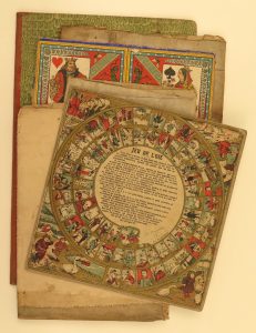 Plaisant jeu sur le modèle des jeux de l'oie. Le premier qui arrive à la gare terminus (63) a gagné, mais il doit pour cela éviter les accidents, les retours en arrière prévus par la règle et les ralentissements imposés par les six stations placées sur le parcours.Joint : 4 jeux de l'oie, s.d. Chromolith., Paris, diff. formats (1 entoilé et usagé, 1 plié). - Oorlogsspel, s.d. Chromolith., Amsterdam, Ellerman, Harms & co, 53 x 63 cm, entoilé (usagé, déchiré). - 1 autre jeu. (6 pcs)