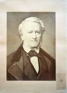 très grand et rare portrait photographique de Richard Wagner par Friedrich Bruckmann. Sur le montage, Wagner a écrit cette dédicace sur une carte du photographe Steinberg, installé « perspective de Nevsky, au coin de la rue Michel, maison Mestchersky, n°38 » [à Saint-Pétersbourg] : « À monsieur Pirondi, Richard Wagner, toujours encore au doigt souffrant. Genève 8 févr. 66 ». [Le chirurgien François Simon Sirus Pirondi (1811/1908), fut membre de l’Académie de médecine ; il était aussi un musicien amateur accompli. Dans ses Mémoires, Armand de Pontmartin raconte qu’il chantait Verdi et Wagner, sur scène avec son ami Ivanov, accompagné de l’orchestre de la ville de Marseille]. La liaison de Wagner avec Cosima von Bülow puis la naissance de leur fille naturelle Isolde, en 1865, firent scandale. Le compositeur tombe alors en disgrâce auprès des membres de la Cour de Bavière, qui le soupçonne d’influencer de façon néfaste le jeune roi Louis II, qui dilapide des sommes disproportionnées pour son maître ; Wagner est contraint de s’exiler en Suisse. Le 6 décembre 1865, il quitte la Bavière et le 23 décembre s’installe à Genève dans la villa «  Les Artichauts  », près du jardin des Cropettes. Il se remet alors à la composition des Maîtres Chanteurs de Nuremberg qu’il avait interrompue en été 1864. Le 21 janvier 1866, il quitte momentanément Genève pour voyager dans le sud de la France [peut-être y rencontra-t-il le docteur Pirondi qui exerçait à Marseille ; le dos du carton d’encadrement porte l’étiquette « Carlos Braun, 32 rue Grignan, à Marseille »]. De retour à Genève, il apprend la mort de son épouse Minna restée en Allemagne, mais ne se rend pas aux obsèques. Il s’installe alors à Tribschen, près de Lucerne, avec Cosima, sur les rives du lac des Quatre-Cantons. Ce portrait est inconnu de toute l’iconographie wagnérienne que nous avons pu consulter.