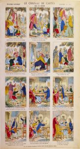 Billet des rois n° 100. [Turnhout, Brepols et Dierck selon une note], s.d. Doublée. - Le château de cartes. Fable de Florian. Lithogr. rehaussée au pochoir et à l'or, Pont-à-Mousson, Haguenthal, XIXe s. Doublée. Jolie pièce. - 2 couvertures illustrées de cahiers, XIXe s. : Turnhout, Glénisson & Van Genechten, 4 images en noir sur papier teinté en bleu, légendes bilingues français/néerl. Vues de Bruxelles, Saint-Pétersbourg, Valparaiso et Bombay. - Leiden, Noothoven van Goor, 4 images édifiantes ou amusante sur papier rose (doublé), légendes en néerl. - [Tytgat, Edgard] - Histoire du faro et du lambic à travers les âges. Bruxelles, Saey, s.d., affichette en couleurs. Amusante pièce dans le style des images d'Epinal. Cachet "Supplément au Folklore brabançon n. 66" au verso. - Affichette de la Fondation Marinus. - 4 planches d'images de dévotion publ. à Epinal (doublées) : Saint Donat (6 images identiques sur 1 f.), Galerie religieuse n. 1046 et 1047 (1 avec cachet de colportage daté 1877), Saintetés. - 1 autre pièce.  Joint : Canards du siècle passé. Présentés par J.-P. Seguin. Paris, Horay, (1969), in-folio, toile d'édit. (min. souill.). Bon ex.