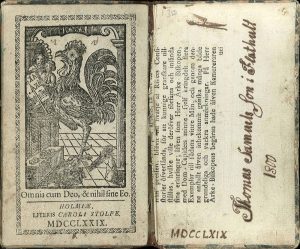 8vo, cont. half leather, marbl. covers & edges, [8] ff. (minor soiling). Very good copy. Extr. rare early Swedish ABC book (“Hanenboek”), teaching the alphabet and some Latin prayers. Printed on greyish, somewhat coarse paper. Large woodcut of singing cock at the end. Cont. ownership entries on endpapers. Ref. Regina Stockholm (1). Cp. Gumuchian 11 and Children’s World of Learning 18 (both 1812 ed.). Joined : Hundt, Peter Franz Eberhard – Aachener Handfibel. Zweite Abtheilung in Druckschrift. Aachen, Vlieckx, 1854, 8vo, marbl. wr., [2]-16 pp. Rare German starter’s book by P.F.E. Hundt (1794-1877). Ref. Not in Children’s World of Learning. (2 vol.)