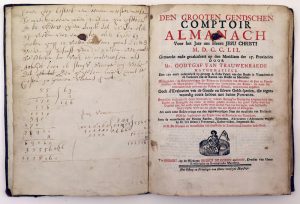 Almanac - Ghent - VAN TRAUWENRAEDE, GodgafDen grooten Gendschen comptoir almanach voor het jaer ons Heere Jesu Christi M.D.C.C.LII. Gemaekt en gecalculeert op den Meridiaen der 17. Provintien (...). Ghent, Wid. P. de Goesin & son, 1752
