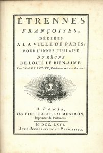Almanac - Paris - PETITY, Jean-Raymond deÉtrennes françoises, dédiées à la ville de Paris; pour l'année jubilaire du règne de Louis le Bien-Aimé (...). Paris, Pierre-Guillaume Simon, 1766 (14/12/1765)