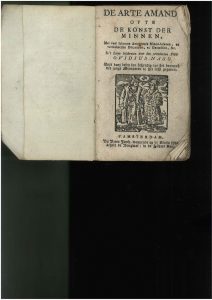 8vo, old decorative wr., 112 pp. printed on coarse paper (somewhat dog-eared). Good copy. Apparently unrecorded (?) ed. of a popular adaptation of Ovid’s Art of Love. Woodcut ornament on title, full-page woodcut on verso of title, sm. woodcut at top of A2r. Gothic type. Armorial bookpl. of the Tilburg archivist F.H.M. Ouwerling (1883-1960).