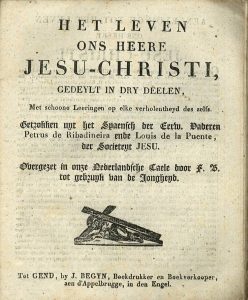 4to, orig. blauw omslag (los, def. aan rug en hoeken), etui, 56 p. (vochtvlekken, losjes). Gentse druk van een volksboek over 3 "voorbeeldige vrouwen". 3 houtsnede-ill. op titelblad (en 2 deeltitels) en 12 houtsneden in tekst. Gedrukt in gotische letter, in 2 kol. Ref. Devolder V-1110. Le livre populaire 94. Bibl. gantoise IV 5860. Niet in Children's world of learning. Bijgevoegd : Ribadeneira, Petrus, Puenta, Louis de la, S.J. - Het leven ons Heere Jesu-Christi, gedeylt in dry deelen (...). Gent, J. Begyn, [c. 1800], 4to, orig. omslag, 56 p. (laatste blad ontbreekt ?, min. vlekken). Goed ex. op grof papier. Latere herdruk. Geïll. met houtsneden : ill. op titelp. en 6 in tekst. Gotische letter, in 2 kol. Approbatie 1763. Ref. Bibl. gant. 5820. Le livre populaire 239. Vgl. DBS IV c. 1743-1744 (Ghent, Wid. Gimblet). Niet in Children's world of learning. - Geschiedenis der edele en schoone Melusina, die eene meermin, en koning Helmas dochter was. Naer het Hoogduitsch. Gent, G. Crombez, s.d., 12mo, uitgeversomslag (vuil), 62 p. - Het dobbel kabinet der christelyke wysheyd besluytende in korte vraegen en antwoorden de eerste beginselen en leeringe van het Katholyk geloof (...). Gent, B. Poelman, [c. 1740], 4to, genaaid, [28] bl. (B3 & B6 los). Zeldzame Gentse uitgave van een religieus schoolboek. Geïll. met 49 kleine houtsneden in tekst. Approbatie 1740. Stempel op titelp. verwijderd. Ref. Bibl. gant. 9373. Vgl. Le livre populaire 314-326. (4 vol.)