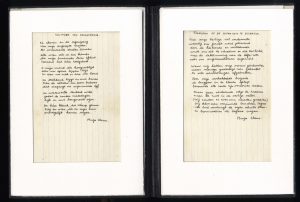 gemonteerd onder passe-partout in uitvouwbare lederen map. In zeer goede staat. 1. “Solitude van Armstrong”, 18 rr., inc. “De chorus en de tegenzang”, waarschijnlijk o.i.v. “(In My) Solitude”, jazz standard van Duke Ellington (1934), gezongen door o.m. Louis Armstrong. 2. “Toeristen op de Alpha-rots te Elsbrück”, 18 rr., inc. “Wat onze heilige ziel verdoemde”.