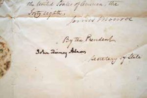 - Brevet de consul de France à Baltimore, signé par Louis XVIII, et contresigné par CHAtEAUBRIAnD, comme ministre des Affaires étrangères. Sur parchemin, en partie imprimé, sceau sous papier. Paris, 5 juillet 1823. - Pièce signée par James MonRoE (1758/1831), 5e président des États-Unis, et contresignée par John Quincy ADAMS (1767/1848), 6e président des États-Unis, alors secrétaire d’État. Washington, 17 avril 1824. Sceau sous papier. Brevet reconnaissant Alexandre Pillavoire comme consul de Baltimore et l’autorisant à exercer sa charge. Rare document réunissant la signature de deux présidents américains.