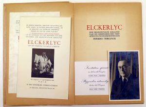 4to (marges licht gebruind), genaaid (omslag licht gebruind, defecten aan rug). Mooie typografische druk in rood en zwart, uitgegeven door "Institut supérieur des arts décoratifs", een hogeschool opgericht door architect Henry Van de Velde. Hieraan toegevoegd zijn een foto van H. Teirlinck, een uitnodiging en 2 programmaboekjes voor de voorstelling van "Elckerlyc" in het Koninklijk Conservatorium te Brussel in 1939.