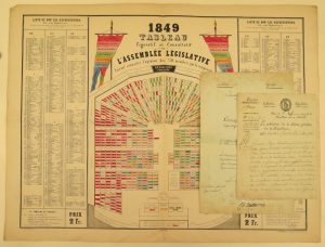 1 double f., in-8, en-tête impr. (pet. rouss.). Autorisation de rentrer en France accordée à Philippe Ignace Bernard, "ex-principal du collège de Poitiers (...) Il devra préalablement justifier de sa promesse de fidélité à la Constitution, et de son engagement à la renouveller, dès son arrivée, devant les autorités constituées". Joint : Delacroix, Charles - Sign. aut. comme préfet du département des Bouches-du-Rhône, sur une copie ms. d'un document signé par Hugues B. Maret et Fouché, s.l., 24 thermidor an 9, 1 f., pet. in-folio (rouss.). Sur arrêt de "Bonaparte premier consul", nomination de Permon comme commissaire général de la police à Marseille. - 1849. Tableau figuratif et consultatif de l'Assemblée législative faisant connaître l'opinion des 750 membres qui la composent. Paris, J. Cartault, graveur-impr., Lith. Barban, chez l'auteur, Aubert, Lemiere e.a., 1849, feuille volante, 54 x 70,5 cm. Plis. 1er tirage de ce rare tableau lithographié présentant au centre la composition de l'assemblée, dont chaque membre est désigné par un petit cartouche numéroté colorié en fonction de ses opinions; celles-ci sont détaillées au moyen de 2 banières coloriées flanquant le tableau : rose foncé (Montagnards), rose (Républicains avancés), rose clair (Républicains modérés), vert (Légitimistes), orange (Conservateurs), bleu (Tiers-parti), bleu foncé (Opinion napoléonienne) et panaché (Opinion flottante). A dr. et à g. les noms des membres sur 3 colonnes alphabétiques. Suite à la proposition Rateau, l'assemblée législative fut dissoute en janvier 1849; la nouvelle assemblée élue les 13 et 14 mai se composa dès lors d'une majorité conservatrice et monarchiste. (3 pcs)